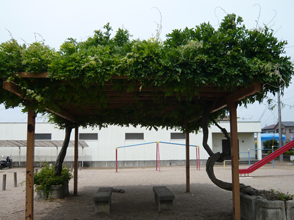 - プールで泳いだ後は藤棚の木陰でちょっと休憩。