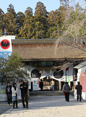 鳥居をくぐって158段の石段を上ると、神門の向こうに四社殿が立つ。左から夫須美大神を祭る西御前(第一殿)、速玉大神を祭る中御前(第二殿)を合わせた相殿、その右隣に熊野造の証誠殿が立ち、主祭神の家津御子大神[けつみこのおおかみ]を祭る本殿となっている。さらに右隣の若宮(第四殿)には天照大神が祭られている。伝承によると、社殿創建は今から2020年ほど前の崇神天皇の時代。500m下流の大斎原[おおゆのはら]に鎮座していたが、1889年(明治22)の大洪水で一部社殿が流失し、現在の地に移築された。